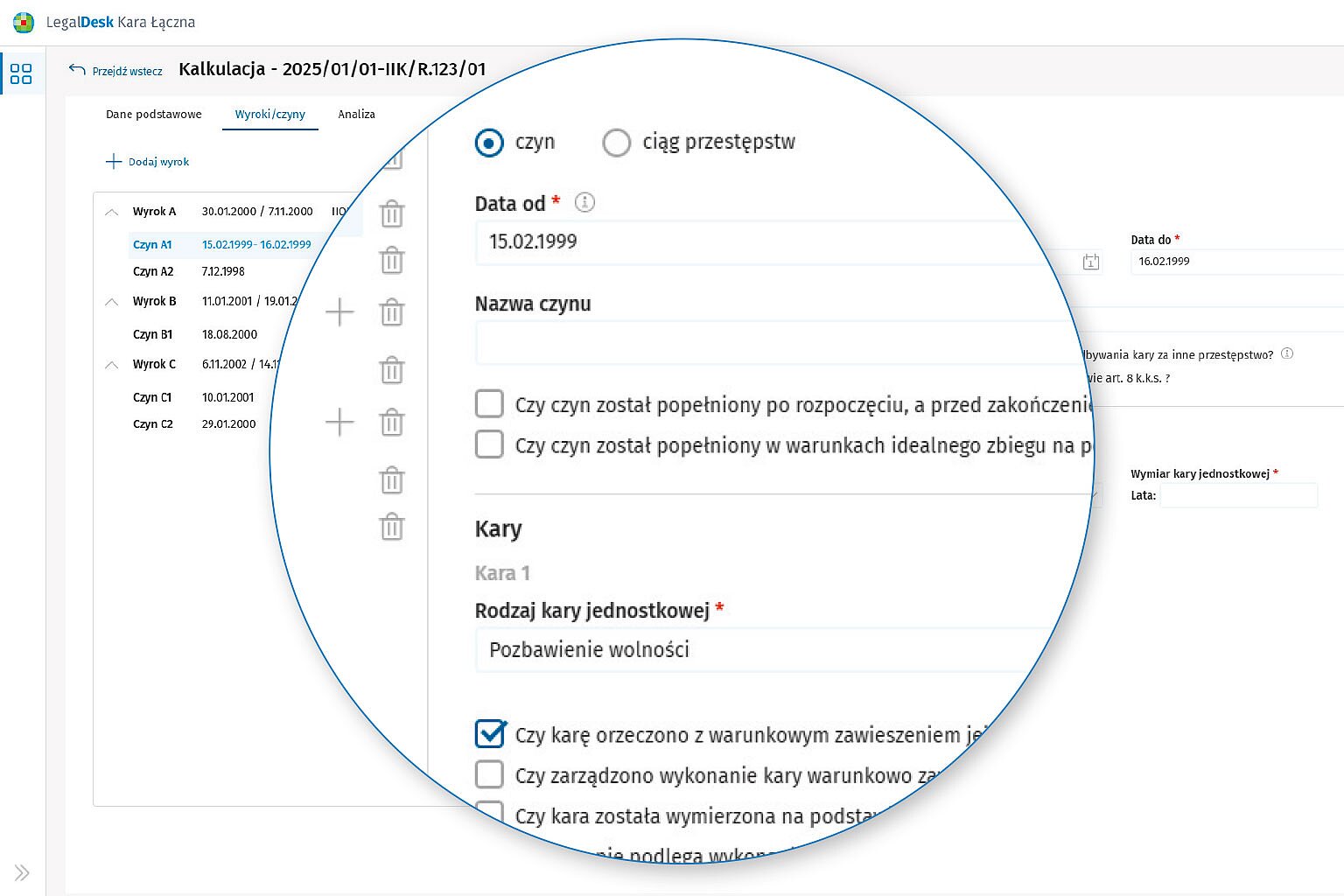 - Automatyczna kalkulacja granic wymiaru kary łącznej – wystarczy wprowadzić dane z wyroków, a system samodzielnie wskaże dopuszczalność orzeczenia kary łącznej oraz granice jej wymiaru.