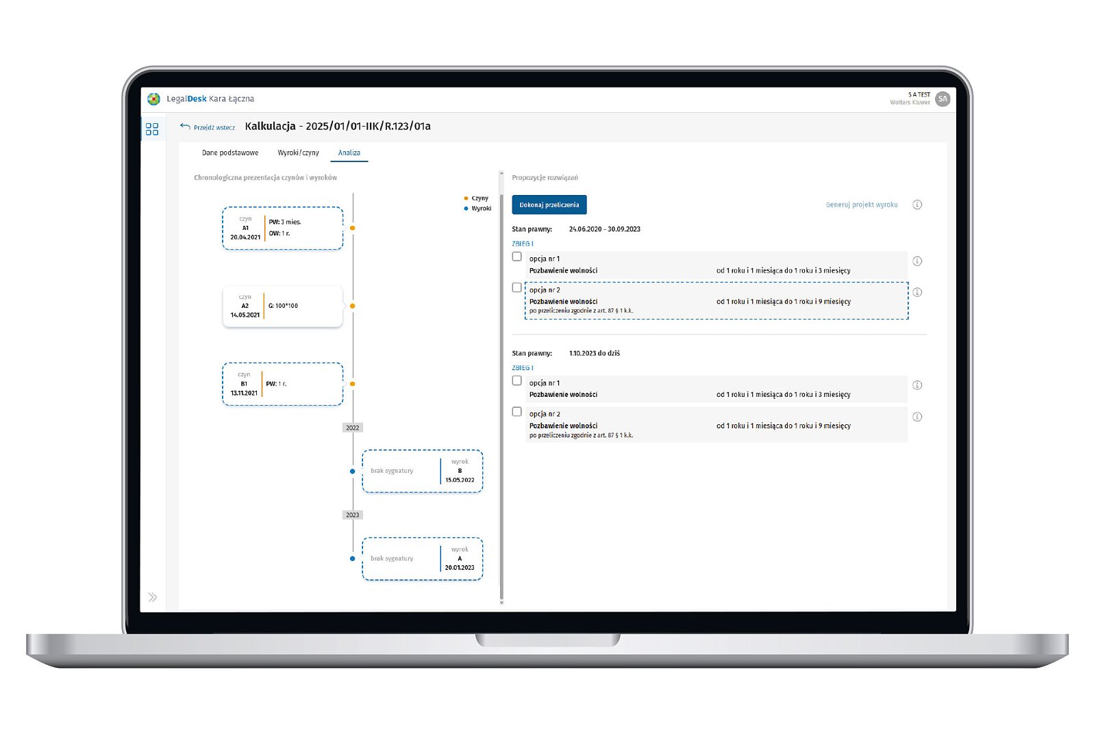 Generowanie kalkulacji – aplikacja przedstawia propozycje rozwiązań, sygnalizując ewentualne kwestie sporne. Dane są prezentowane graficznie, co pozwala szybko zrozumieć sekwencję zdarzeń.