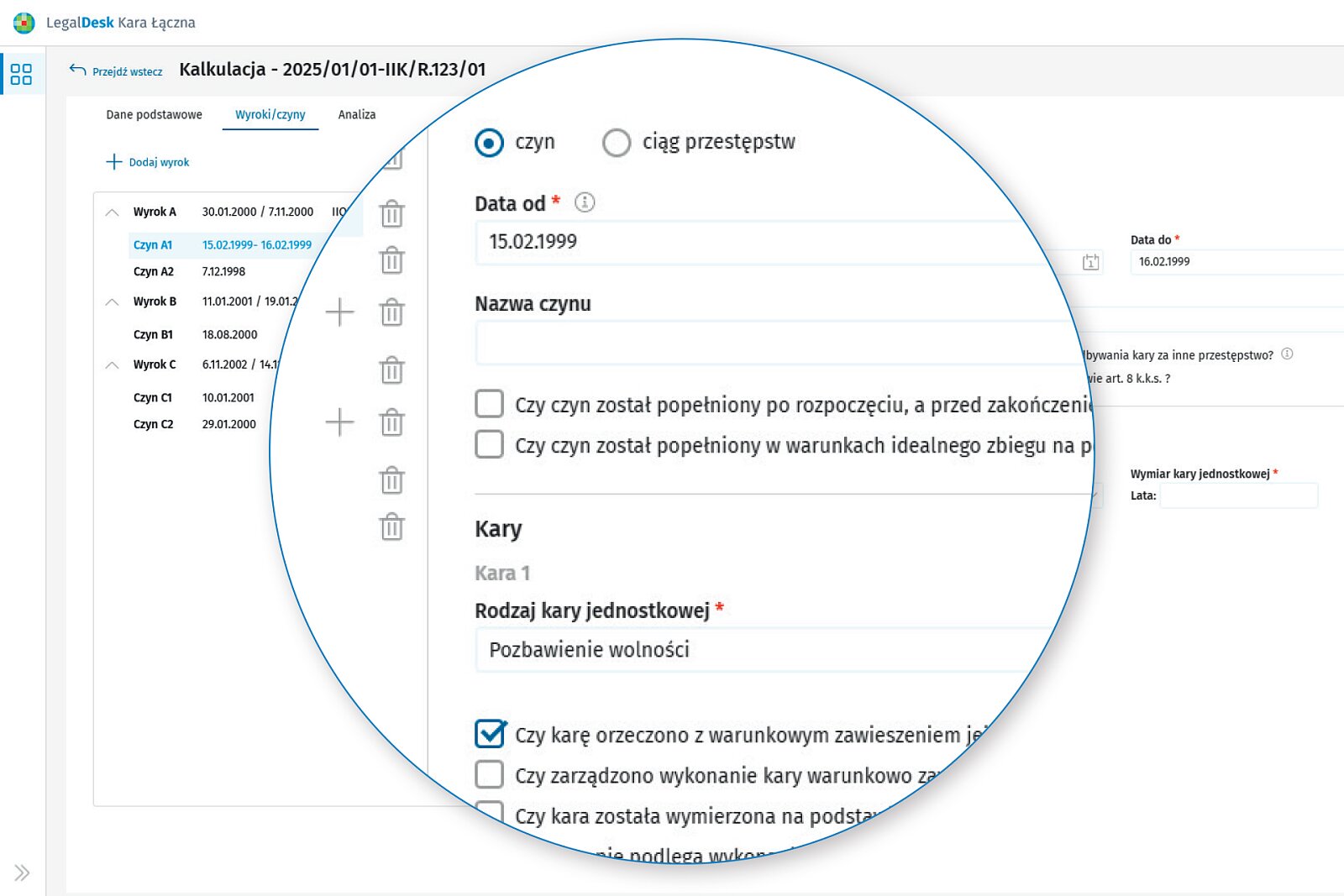 - Automatyczna kalkulacja granic wymiaru kary łącznej – wystarczy wprowadzić dane z wyroków, a system samodzielnie wskaże dopuszczalność orzeczenia kary łącznej oraz granice jej wymiaru.