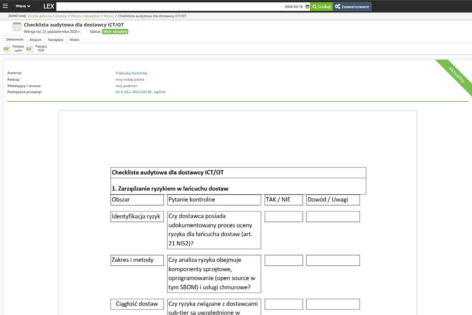 Zakres wzorów w systemie LEX Cyberbezpieczeństwo obejmuje m.in.: