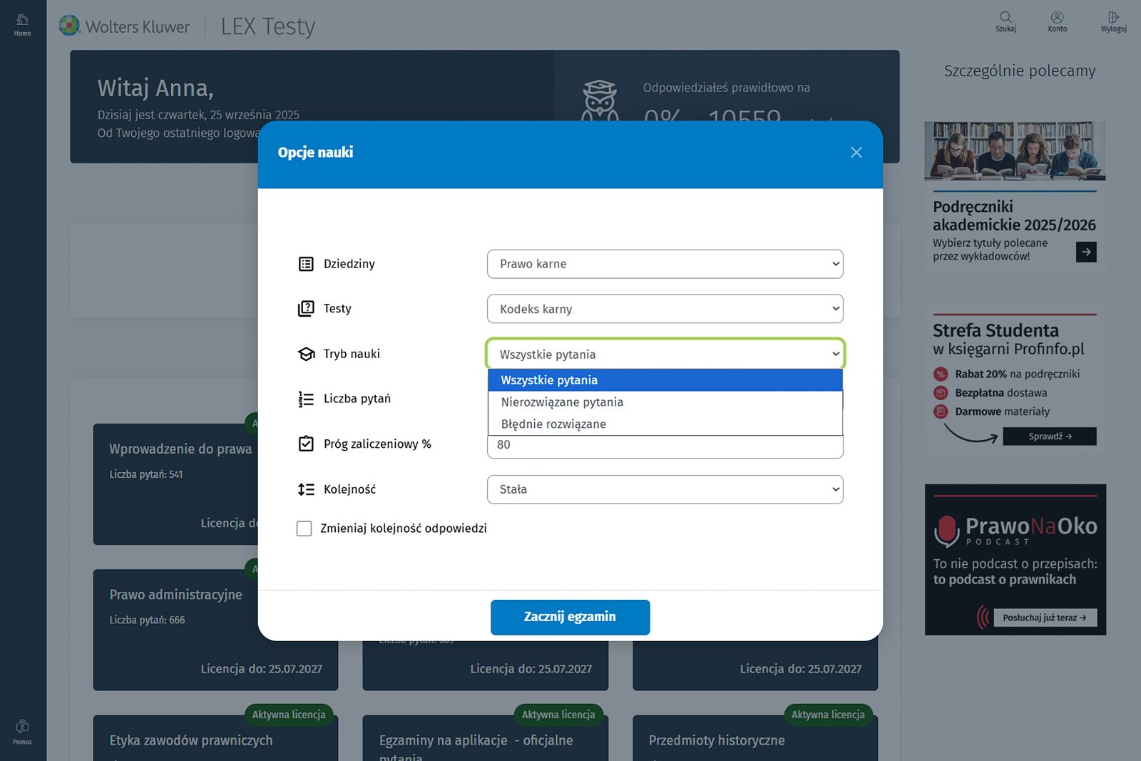 Wybieraj dziedziny prawa, ustaw próg zaliczeniowy i śledź postępy. Możesz wybrać sposób uczenia się taki, jaki najbardziej Ci odpowiada w zależności od tego co chcesz osiągnąć. Tryb nauki daje natychmiastową informację zwrotną, a tryb egzaminu pozwala ćwiczyć w warunkach zbliżonych do prawdziwego testu. Możesz wybrać ile pytań chcesz rozwiązać oraz śledzić, ile pytań już przerobiłeś i które sprawiają Ci trudność. Zamiast chaotycznej nauki – masz plan, kontrolę i motywację. A to przekłada się na lepsze wyniki.