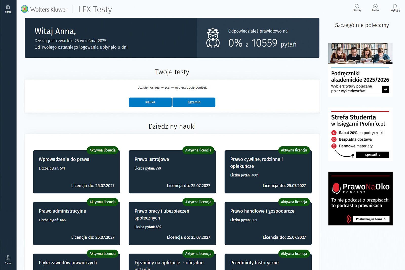 Rozwiązuj testy stworzone przez ekspertów akademickich, którzy na co dzień uczą i egzaminują studentów. Opieramy się na wiedzy, doświadczeniu i jakości marki LEX – lidera wśród systemów informacji prawnej w Polsce – by dać Ci pewność, że uczysz się z materiałów, którym naprawdę możesz zaufać. Pytania są zgodne z sylabusami i podręcznikami, dzięki czemu uczysz się dokładnie tego, co będzie wymagane na egzaminie