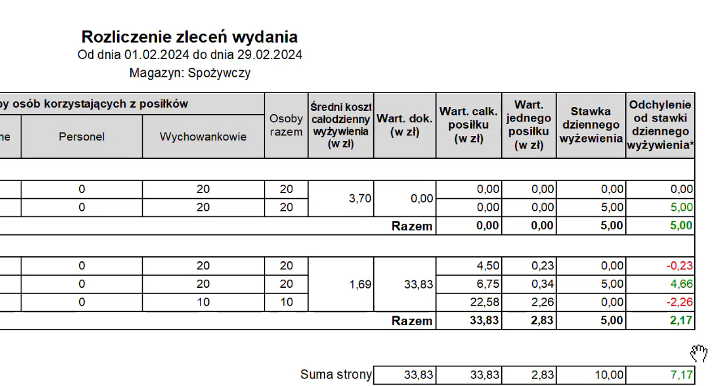 System wspiera bieżącą kontrolę kosztów żywienia poprzez wyliczanie średnich kosztów posiłków, co ułatwia analizę wydatków i lepsze planowanie budżetu placówki. Dzięki temu masz stały wgląd w koszty i możesz szybciej reagować na zmiany cen lub zużycia produktów.
